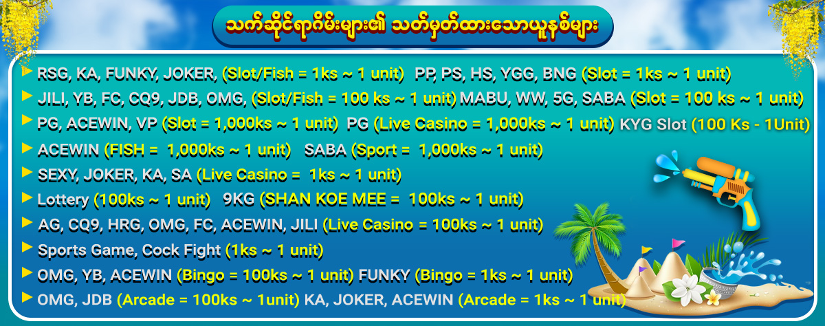 2. Slot ဂိမ္းအားလုံးတြက္ခ်က္ေပးပါသည္။(YGG ၊ ACE WIN မပါဝင္ပါ)အႏိုင္ရရွိေသာဆုမ်ားကို ႀကိမ္ေရတစ္ဆကစားၿပီးမွသာလွ်င္ေငြထုတ္ႏိုင္မည္။